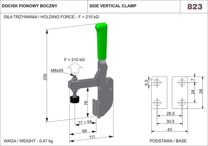 - sprzedawane w komplecie z ocynkowaną śrubą dociskową M8x55, zakończoną stopką gumową