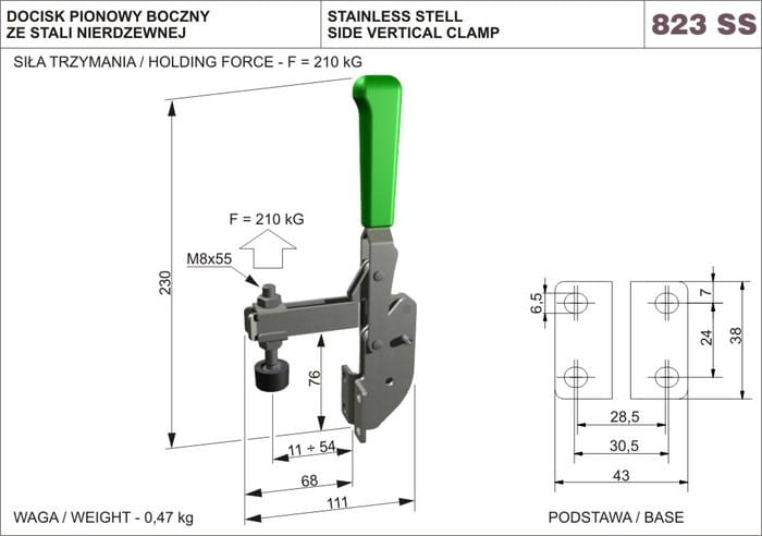 - sprzedawany w komplecie z nierdzewną śrubą dociskową M8x55, zakończoną stopką gumową