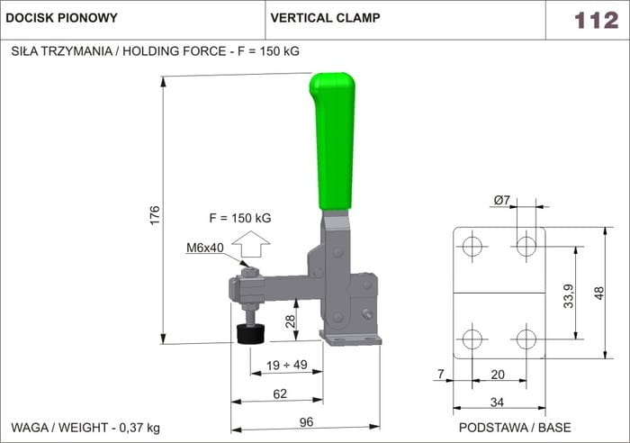 - sprzedawane w komplecie z ocynkowaną śrubą dociskową M6x40, zakończoną stopką gumową