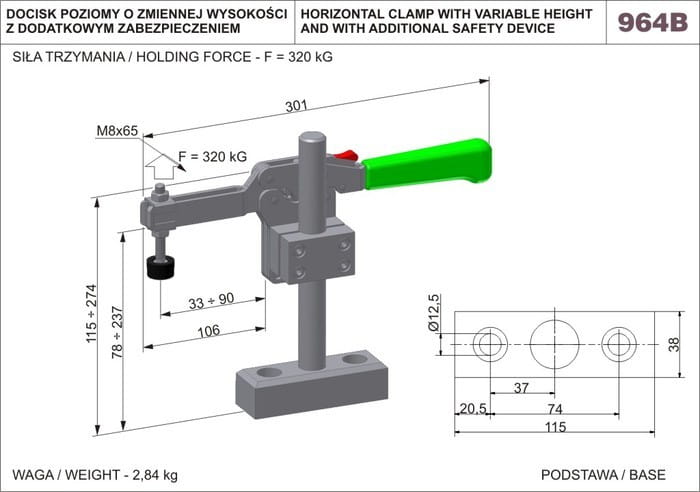 - osadzony na słupie pozwalającym na zmianę wysokości docisku w przedziale od 115 mm do 274 mm