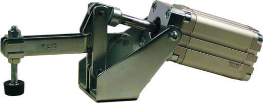 Docisk poziomy ręczny nr 806 został wyposażony w siłownik pneumatyczny PNEUMAX i obudowy z blach. Otrzymaliśmy nowy typ docisku umożliwiający szybką wymianę docisków ręcznych ( np. 803 ) na pneumatyczne ( np. 803 P ) bez konieczności dokonania gruntownej przebudowy przyrządów.